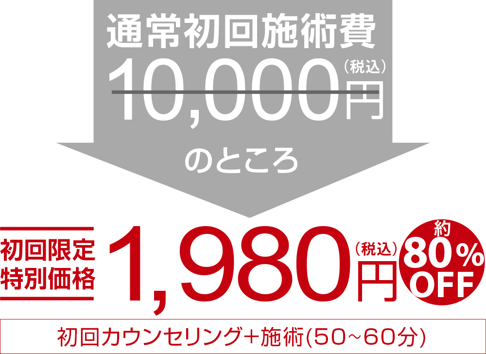 治療院を選ぶときに「高いお金を払って私に合わなかったらどうしよう」と不安になるかと思います。そんな方が勇気を持って一歩踏み出して頂くために当院の、初回の金額を大幅に引かせて頂いております。
